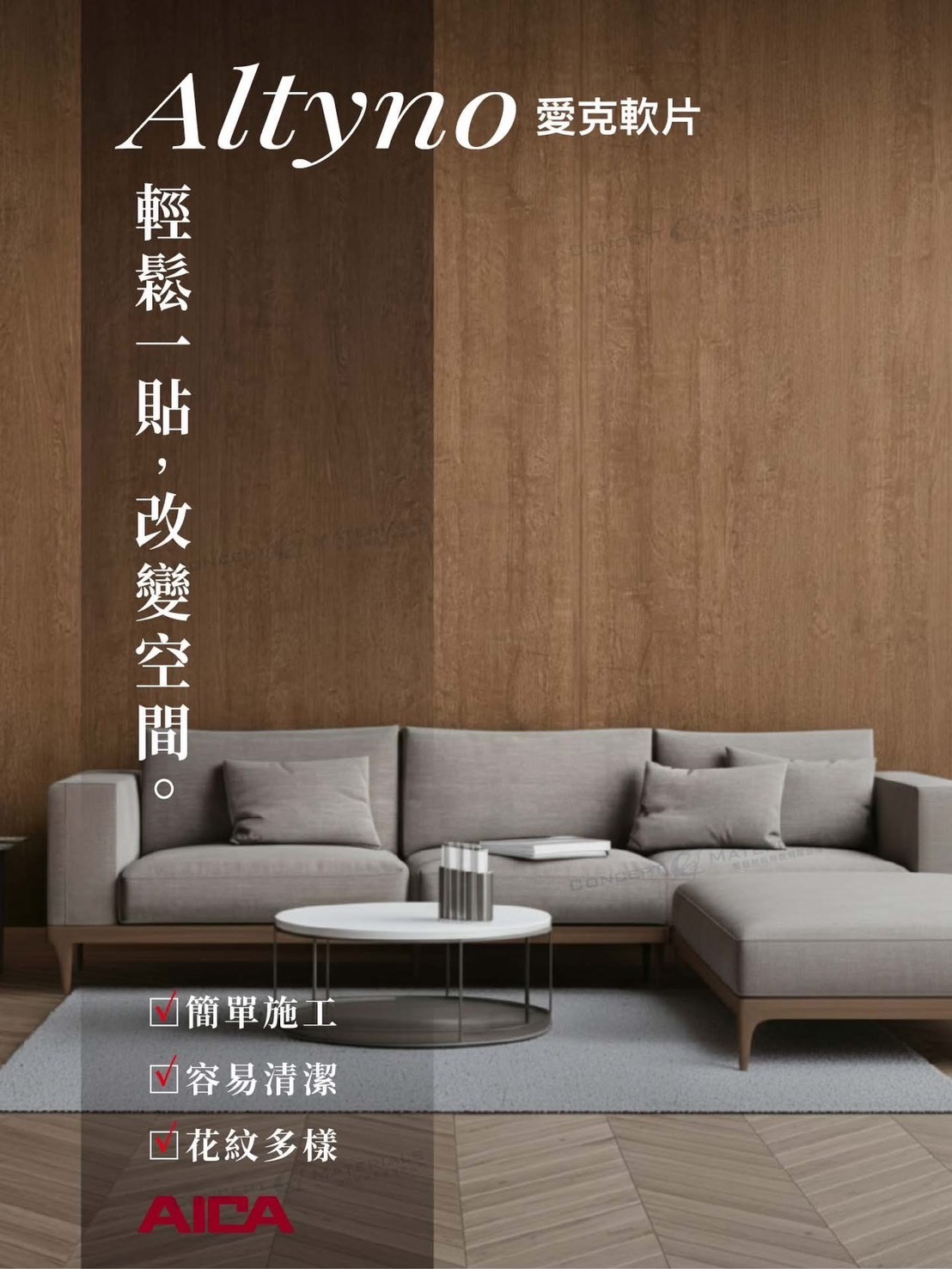 Altyno 愛克軟片是一種輕薄且具有豐富紋理的裝飾貼膜。其優異的延展性與易施工特性,能快速覆蓋各種曲面與舊有表面,讓空間在不破壞原有結構的基礎上,煥然一新。是舊屋翻新與局部裝飾的理想選擇。