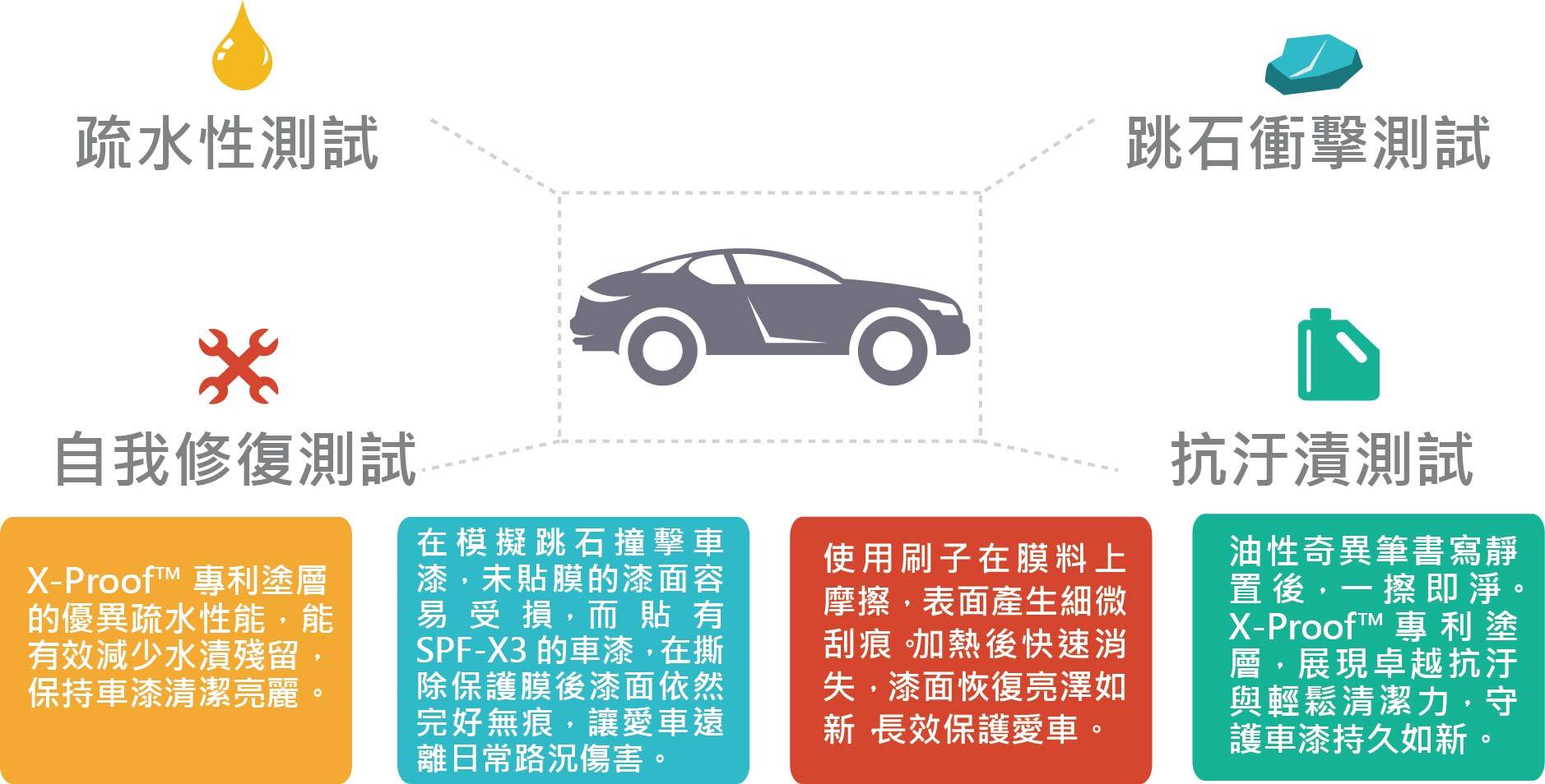 核心的X-Proof™ 專利塗層,是漆面保護膜的關鍵防線。具備耐刮、抗黃、抗污、疏水疏油及自我修復等多重功效,有效抵禦環境污染、鳥糞、雨痕與紫外線侵蝕,避免膜料泛黃老化。日常細微刮痕在陽光或加熱下即可自動修復,保持車漆始終亮麗如新。